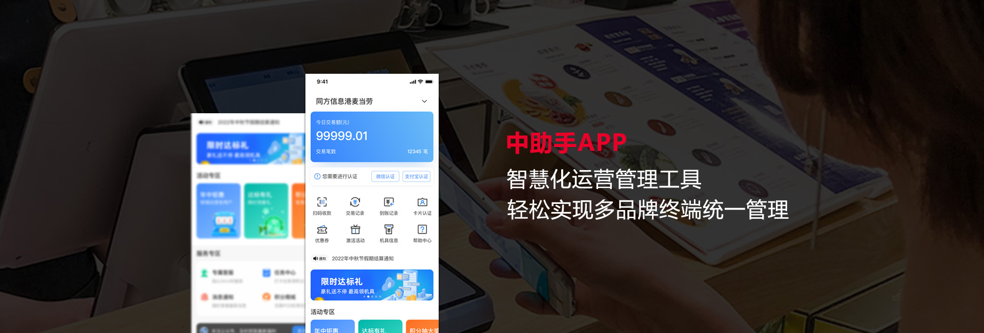 中助手是一款专为广大中小微商户量身打造的综合性高效运营工具,集合多品牌于一体,支持商户账号信息自主设置、多设备在线管理、运营数据快速查询、微信动态通知等功能,致力于解决商户经营“痛点”,促进广大传统商户的数字化升级!